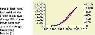 De første kliniske genterapiforsøg fandt sted tilbage i 1990, og siden har mere end 3.000 patienter deltaget i over 1.000 kliniske forsøg. De høje forventninger, der var til feltet i starten af 1990'erne, har været svære at indfri, og de overdrevne forventninger blev aflyst af skuffelse og skepsis. I hele perioden er publikationsfrekvensen og opstarten af nye kliniske genterapiprojekter dog fortsat (Figur 1 ).