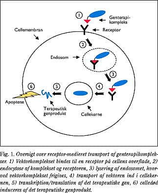 Receptorernes funktionalitet spiller en afgørende rolle i forbindelse med targeting. Dette er bl.a. blevet påvist i studier med epidermal growth factor (EGF)-receptoren, hvor resultaterne viste, at receptorens funktionalitet var en mere betydende faktor end det aktuelle antal af cellulære receptorer (20, 22). Det er endvidere vist, at hvis genmaterialet kobles til receptorbindende ligander, såsom EGF eller transferrin, der binder til transportkompetente receptorer, øges optaget af komplekset væsentligt (Fig. 1) (20).