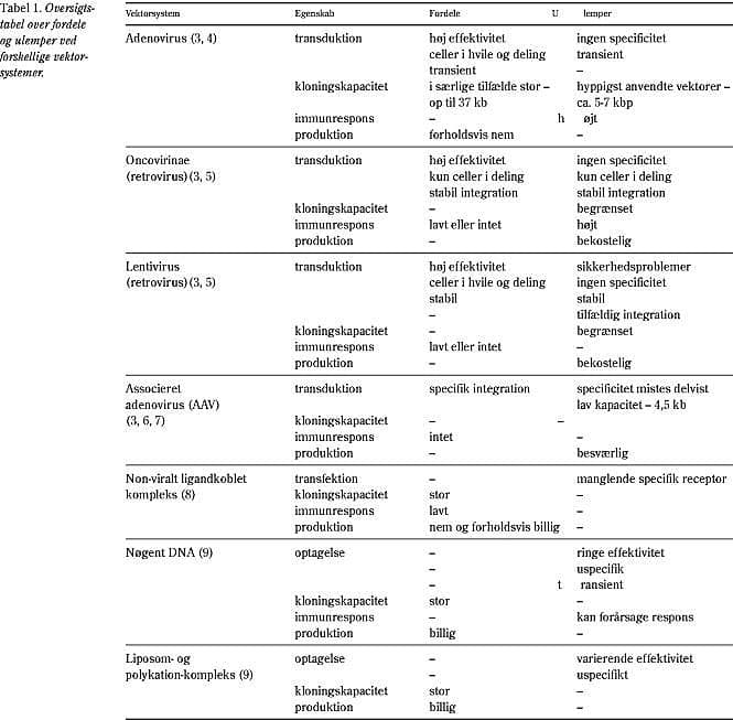 Hidtil har mange af de kliniske protokoller benyttet sig af lokal injektion af genmateriale i tumor (1, 2). Fordelen ved denne metode, i eksperimentelt øjemed, ligger i muligheden for at inducere lokal tumorkontrol og teste surrogat-effektmål, såsom aflæsning og virkning af det injicerede genprodukt. Et væsentligt problem er dog fordelingen af genmaterialet, idet ikke alle celler bliver ramt ved injektionen, og genmaterialet ikke spredes ved intercellulær diffusion, men har en tendens til at lokalisere sig omkring »nålesporet«. Ydermere vil der ved tilbagetrækning af nålen afsættes genmateriale i det raske væv, hvilket især er et problem ved anvendelse af genmateriale, hvis produkt er toksisk (2). Til patienter med systemisk sygdom kan denne form for administration af gode grunde ikke anvendes. Det er derfor nødvendigt at udvikle en systemisk behandling, hvor genmaterialet kan pakkes i et kompleks, som er beskyttet imod nedbrydning i blodbanen, således at det når intakt og funktionelt frem til target-cellerne. Derudover skal komplekset formuleres således, at den uspecifikke binding til erytrocytter og diverse overfladeproteiner på ikke-tumorceller mindskes mest muligt (2).