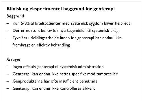Til trods for 20 års intensivt udviklingsarbejde og med mere end 500 kliniske protokoller (http://www.wiley.co.uk/ wileychi/genmed/clinical/, juni 2001) er der endnu ikke designet en effektiv behandlingsstrategi for genterapi. Årsagen er blandt andet, at væsentlige basale problemer vedrørende målrettet targeting af tumorceller endnu ikke er løst. Disse problemer er:
