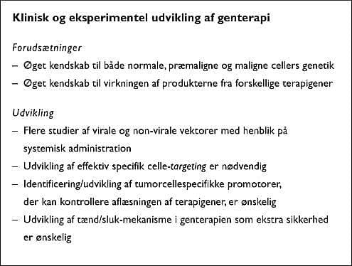 Effektiv genterapi til cancerpatienter vil sandsynligvis være mulig om nogle få år, fordi den nye teknologi gør det muligt at løse de problemer, der er beskrevet i det foregående. Terapien kan i bedste fald træde i stedet for allerede eksisterende behandling, men mere realistisk opfattes som et supplement til anden anti-neoplastisk behandling. Terapien hviler på såvel genotypisk som fænotypisk viden om den enkelte patients tumor. Da denne er karakteriseret ved forskelle fra tumortype til tumortype samt forskelle mellem celler inden for den enkelte tumor, skal man ikke forvente at kunne udvikle et universelt system, der kan anvendes til alle. I den overordnede terapistrategi må man derfor vælge, at der udvikles lægemidler, der følger samme princip, men hvor de enkelte elementer sammensættes forskelligt baseret på den enkelte tumors biologiske karakteristika. I den kliniske hverdag vil det blive en individualiseret behandling, der integrerer den grundvidenskabelige forskning i den daglige klinik.