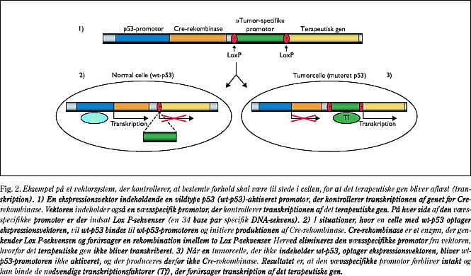 Hvis det viser sig, at det ikke er muligt at finde en promotor, der udelukkende er aktiv i tumorceller, så kan et alternativ være at sikre, at nogle bestemte forhold skal være til stede i cellen, førend det terapeutiske gen kan blive udtrykt (23). En forudsætning kan fx være, at tumor-suppressorgenet, TP53, skal være muteret (defekt) i en celle, førend det terapeutiske gen bliver udtrykt, hvilket hyppigt forekommer i humane tumorer (24). TP53 koder for transkriptionsfaktoren p53, der er et protein, som binder til en bestemt promotorsekvens (en p53-promotor) og derved aktiverer promotoren. I Fig. 2 ses et eksempel på en vektor med denne ekstra specificitet. Vektoren i figuren indeholder to forskellige promotorer, der kontrollerer hver sit gen. Den første promotor er en p53-promotor, der kun aktiveres, hvis der er vildtype (wt-p53) til stede i cellen. Den anden promotor er en »tumor-specifik« promotor, der desværre også udviser lidt aktivitet i nogle normale celler. Når en normal celle, der indeholder wt-p53, modtager vektoren, vil wt-p53 binde sig til og aktivere p53-promotoren, der skal kontrollere produktionen af Cre-rekombinase. Produktionen af Cre-rekombinasen medfører en destruktion af den »tumor-specifikke« promotor, der kontrollerer ekspressionen af det terapeutiske gen. Hvis derimod en tumorcelle, hvori p53 er muteret, modtager vektoren, så vil p53-promotoren ikke blive aktiveret, og der vil ikke blive produceret Cre-rekombinase. Resultatet er, at den »tumor-specifikke« promotor forbliver intakt og kan aflæse det terapeutiske gen (15).