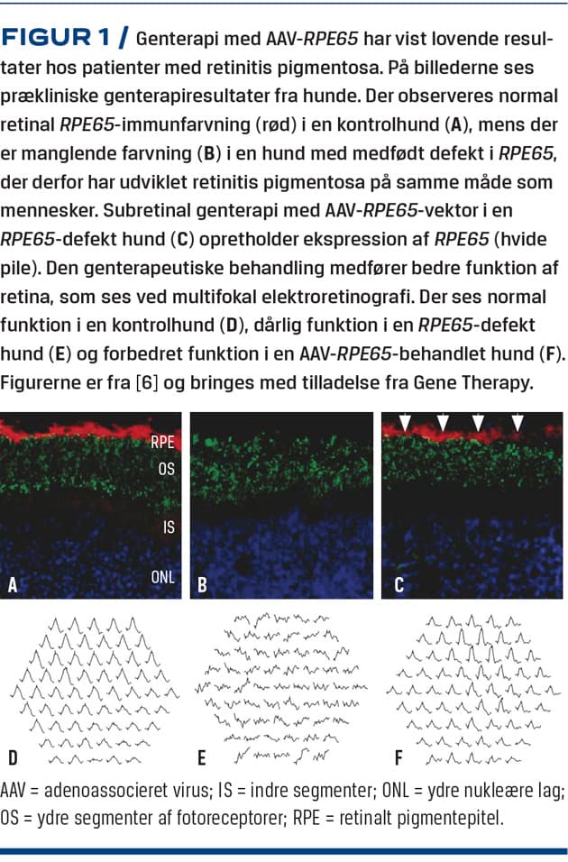 Arvelige øjensygdomme, herunder særligt dem, der forårsager retinitis pigmentosa, er et af de mest lovende områder for anvendelse af CNS-genterapi i den nærmeste fremtid. Behandling af Lebers kongenitte amaurose (LCA) er her længst fremme. LCA skyldes mutation i RPE65, som koder for en isomerase, der omdanner transretinoider til 11-cis-retinoider. Akkumulering af transretinoider forårsager degeneration af det retinale pigmentepitel (RPE) med blindhed til følge. Dyrestudier med subretinal injektion af en AAV-vektor af serotype 2 (AAV2) kodende for RPE65 (Figur 1) [6] banede vej for en række kliniske fase 1-3-studier, hvilket førte til en nylig FDA-godkendelse af voretigene neparvovec [7, 8]. I alle studierne kunne man påvise en klinisk bedring af synsevnen, dog især for det perifere synsfelt. Patienter fra disse studier blev tilbudt at fortsætte i opfølgende ikkeblindede studier for at undersøge langtidseffekten og sikkerhedsprofilen.