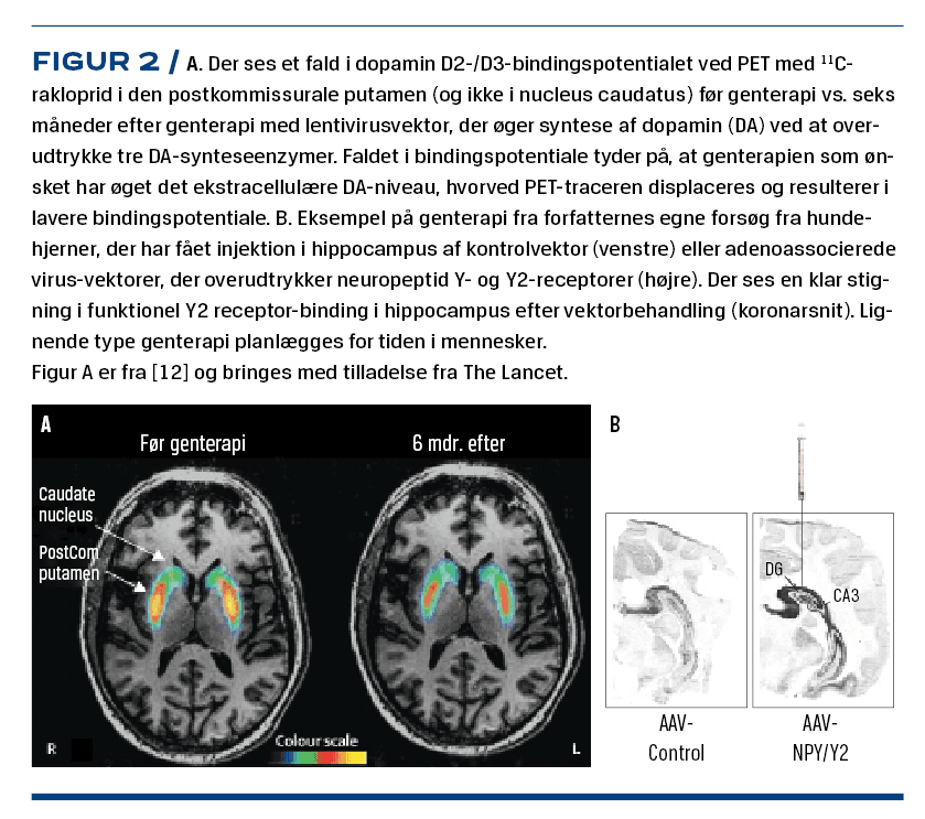 I 1990’erne var der stor optimisme vedr. genterapi som fremtidens behandling, men teenageren Jesse Gelsingers død i 1999 pga. immunreaktion mod adenovirus, der var anvendt til behandling af en sjælden sygdom, stoppede feltet i en årrække. Imidlertid har udvikling af sikre rekombinante virustyper (f.eks. adenoassocierede virus (AAV)) genoplivet troen på genterapien i den seneste dekade [1, 2], hvor en rivende udvikling er startet med dannelse af mange nye biotekfirmaer, ligesom store medicinalfirmaer har fået øjnene op for feltet. I denne artikel vil vi fokusere på sygdomme i centralnervesystemet (CNS), hvor genterapi for nylig har fået vind i sejlene efter godkendelse af voretigene neparvovec i USA og EU til behandling af retinitis pigmentosa og onasemnogene abeparvovec til behandling af spinal muskulær atrofi i USA [1-5].