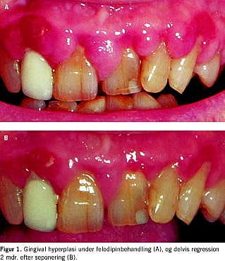 Gingival hyperplasi kan bl.a. ses ved akut myeloid leukæmi og graviditet. Medicininduceret gingival hyperplasi er meget velkendt ved behandling med fenytoin og ciclosporin. Fænomenet er også en velbeskrevet bivirkning ved behandling med calciumantagonister [1], om end kendskabet hertil næppe er udbredt, bl.a. fremgår det ikke af Lægemiddelkataloget eller Lægeforeningens Lægemiddelfortegnelse. Bivirkningen er især set ved brug af dihydropyridin calciumantagonister og her oftest beskrevet ved nifedipin [2], men den er også registreret for verapamil og diltiazem [3]. Mekanismen er måske knyttet til nedsat kollagenaseaktivitet [3, 4].