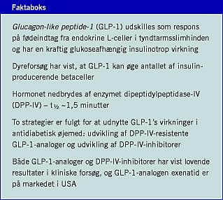 Glucagon-like peptide-1 (GLP-1) udskilles fra tyndtarmen efter fødeindtag. Hormonet har en kraftig insulinotrop effekt og en trofisk virkning på betaceller og søges derfor anvendt til behandling af type 2-diabetes. GLP-1-analogen exenatid, er nu godkendt i USA som add on- terapi. En alternativ strategi er at øge den endogene GLP-1-koncentration ved hjælp af inhibitorer af enzymet dipeptidylpeptidase-IV, der nedbryder GLP-1. Ved GLP-1-baseret behandling opnås en tilsyneladende vedvarende reduktion af glykeret hæmoglobin på ca. et procentpoint, og de få og milde bivirkninger samt den minimale risiko for hypoglykæmi er unikke fordele.