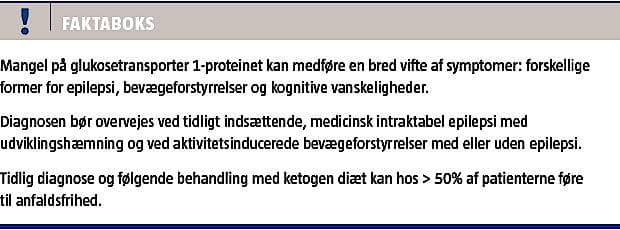 (f.eks. forandringer i regulatoriske eller ikkekodende områder eller forandringer i andre gener, der har indflydelse på GLUT1-proteinets funktion [17]. Står man med en negativ genetisk analyse, men stadig har en mistanke om GLUT1-DS på baggrund af de kliniske fund, kan man begynde med at give patienten ketogen diæt. Hvis patienten derefter bedres markant, vil dette understøtte en GLUT1-DS-diagnose. Påvises en GLUT1-mutation, bør der tilbydes genetisk rådgivning og en vurdering af gentagelsesrisiko.