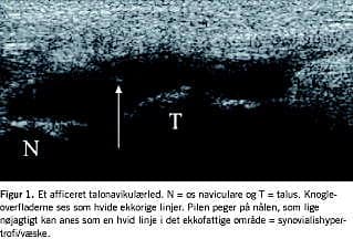 En supplerende magnetisk resonans (MR)-skanning af ankelleddet viste forsat synovitis i talonavikulærleddet, kun sparsom aktivitet talokruralt og ingen aktivitet i knoglerne. Ved en blodprøvekontrol havde patienten fortsat CRP-forhøjelse. Der blev foretaget en ultralydvejledt punktur af talonavikulærleddet med udtømning af få ml uklar ledvæske (Figur 1 ). Ved direkte mikroskopi blev der ikke påvist nogen bakterier, men talrige leukocytter, og patienten blev indlagt til parenteral diclosil- og penicillinbehandling på mistanke om infektiøs artritis.