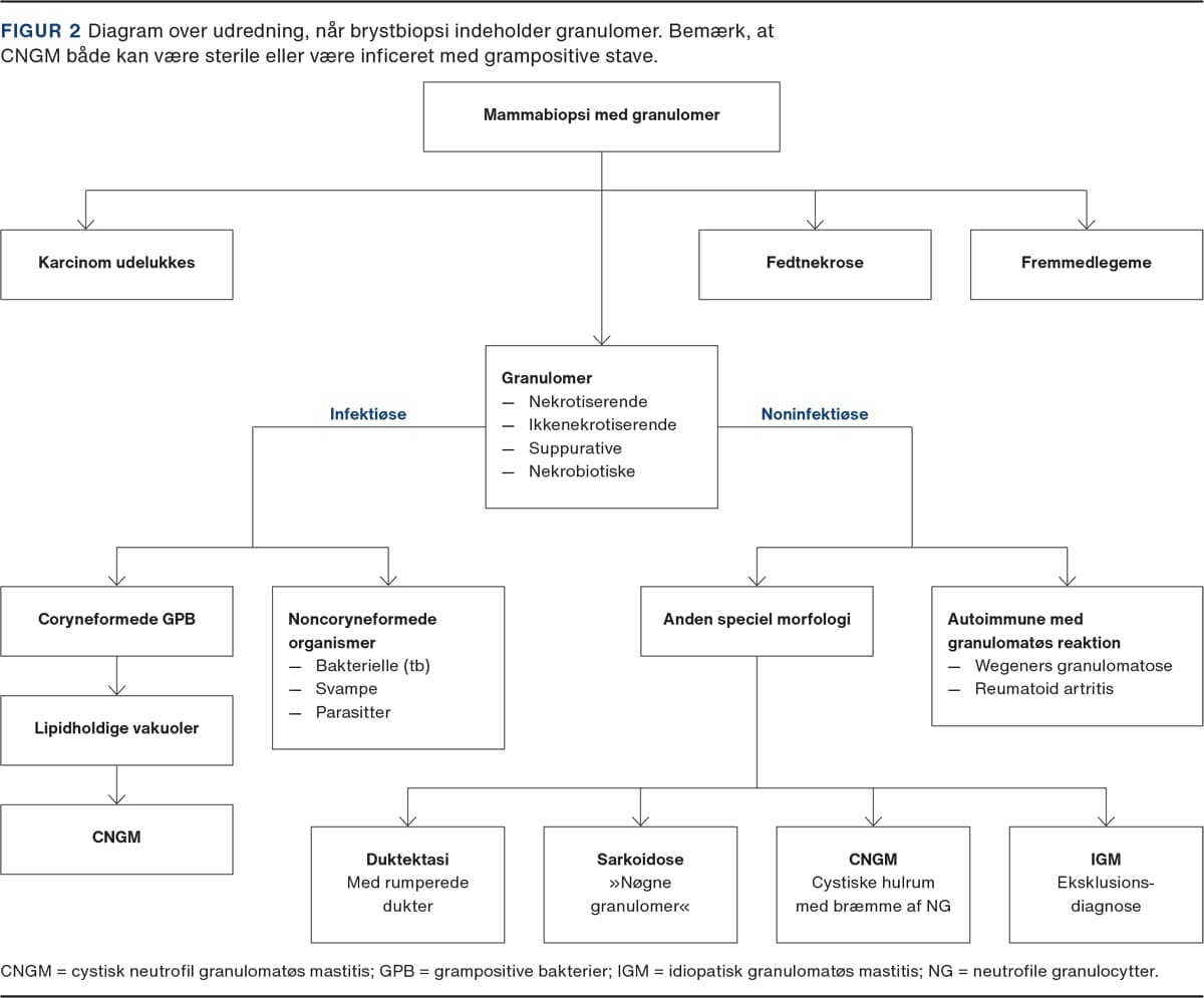 Patientens sygehistorie inkl. oplysning om brug af psykofarmaka er væsentlig. GM udredes med klinisk mammografi og biopsi. Med MR-skanning kan man ikke sikkert differentiere mellem GM og brystkræft, hvorfor det kun anbefales brugt som supplement [12]. Grovnålsbiopsi anbefales, da finnålscytologi har meget lav diagnostisk sikkerhed. Trucutbiopsier skal ofte gentages, ligesom knivbiopsi kan være nødvendig for at opnå tilstrækkeligt vævsmateriale til at stille en diagnose [10]. Ved både grovnålsbiopsi og især excisionsbiopsier risikerer man dog at forårsage forværring i det kliniske billede eller fisteldannelse. Videre udredning afhænger af biopsisvaret. Er biopsisvaret konklusivt for granulomatøs inflammation, udredes der for infektion inkl. tuberkulose, corynebakterier og Actinomyces samt for sarkoidose, Wegeners granulomatose og fremmedlegemer (Figur 2).