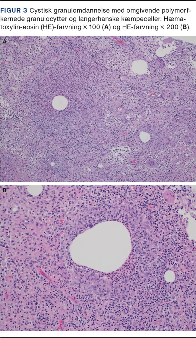 Granulomer er en ansamling af epiteloide histiocytære celler. Ved IGM domineres det histologiske billede af granulomer uden kaseøse nekroser som lobuli og bestående af epiteloide histiocytter, Langerhans kæmpeceller, plasmaceller, lymfocytter og evt. eosinofile granulocytter. Abscesdannelse kan forekomme. Bakterier, svampe og parasitter påvises ikke, og vaskulitis ses ikke. Ved CNGM findes lobulocentrisk granulomdannelse med et eller flere centrale mikrocystiske hulrum omgivet af en bræmme af neutrofile granulocytter [13](Figur 3)[14]. I visse tilfælde ses der grampositive stave i hulrummene, og i andre tilfælde kan der ikke påvises noget infektiøst agens. Det er vigtigt, at man tager flere biopsier ved klinisk mistanke om GM, da der er risiko for negativt biopsisvar.