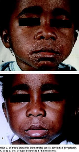 Summary A case of childhood granulomatous perioral dermatitis (CGPD) in a three year old boy from Madagascar Ugeskr Læger 2008;170(5):352 A case of childhood granulomatous perioral dermatitis (CGPD)/ facial afro-caribbean childhood eruption (FACE) in a three year old boy from Madagascar is described. This disorder occurs predominantly in black children until puberty. It is a relatively uncommon condition of unknown aetiology characterized by a monomorphic, papular eruption around the mouth, nose and eyes. The disorder looks like sarcoidosis, but it is benign and self-limited and not associated with any systemic manifestations. In our case we treated the patient with Elidel (pimecrolimus) with an excellent result.