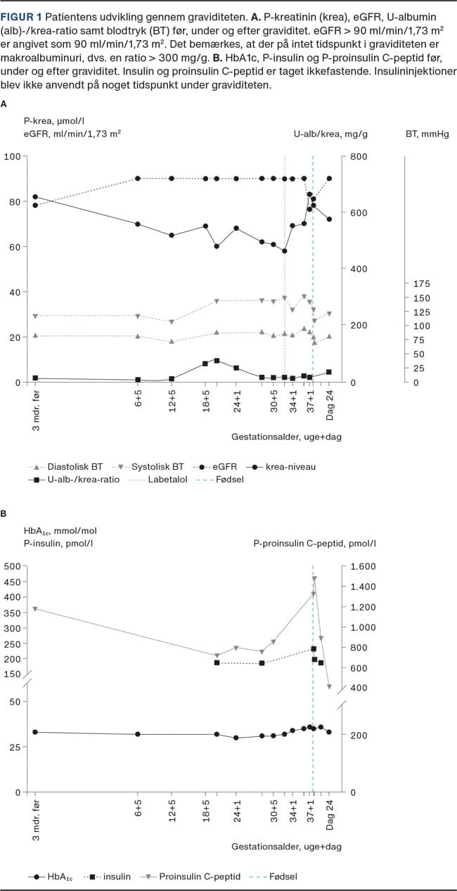 To uger efter fødslen var den nybagte mor i velbefindende. Hun malkede mælk ud til drengen, havde selv tabt sig 10 kg og fik ikke BT-nedsættende medicin. Figur 1A viser udviklingen gennem graviditeten af kreatinin, eGFR og urinalbumin-kreatinin-ratioen. Figur 1B viser HbA1c samt ikkefastende værdier af insulin og proinsulin C-peptid.