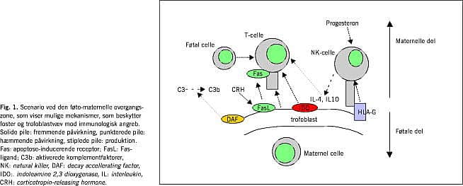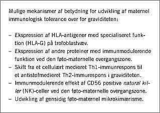 Vi ved således i dag, at placenta ikke er en anatomisk barriere, som separerer moderens og fosterets immunsystem og antigener. På trofoblastvæv findes proteiner, hvis funktion ser ud til at være at hæmme en skadelig maternel immunologisk reaktion over for placenta. Der indtræder primært i uterus en række modifikationer af immunreaktionen under graviditet i retning af humoralt frem for cellulært immunrespons. I løbet af første graviditet udvikles hos både mor og foster, formentligt som følge af mikrokimærisme, hyppigt en gensidig immunologisk tolerance. De vigtigste af de nævnte potentielle mekanismer til etablering af tolerance over for graviditeten er vist i Fig. 1 . Det må understreges, at for de fleste af mekanismernes vedkommende er deres betydning for fosterets overlevelse primært vist i museforsøg. At der tilsyneladende ligger multiple mekanismer til baggrund for udvikling af graviditetstolerance er ikke overraskende, da afkommets overlevelse er af essentiel betydning for artens overlevelse.