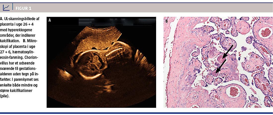 I uge 24 + 5 fandtes føtal vækstretardering med en vægtafvigelse på –18% og –5% hos hhv. gemellus A og B med normale flow i a. umbilicalis og normal fostervandsmængde. I uge 26 + 4 var vægtafvigelsen –17% og –11% hos hhv. gemellus A og B, med normale flow og fostervandsmængde. I placenta forekom der talrige hyperekkogene områder, hvilket var foreneligt med forkalkninger (Figur 1A). Patienten blev i uge 26 behandlet med betamethason pga. vaginalblødning og risiko for snarlig forløsning.
