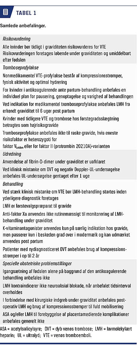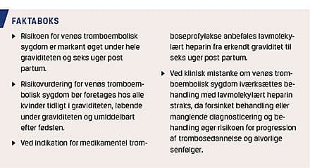 Denne artikel er udarbejdet på baggrund af rapporten »Tromboembolisk sygdom under graviditet og post partum – risikovurdering, profylakse og behandling« (2014), som Dansk Selskab for Trombose og Hæmostase samt Dansk Selskab for Obstetrik og Gynækologi har udarbejdet i fællesskab (www.dsth.dk/pdf/Rapporter_retningslinjer/03_GRAVID.pdf?