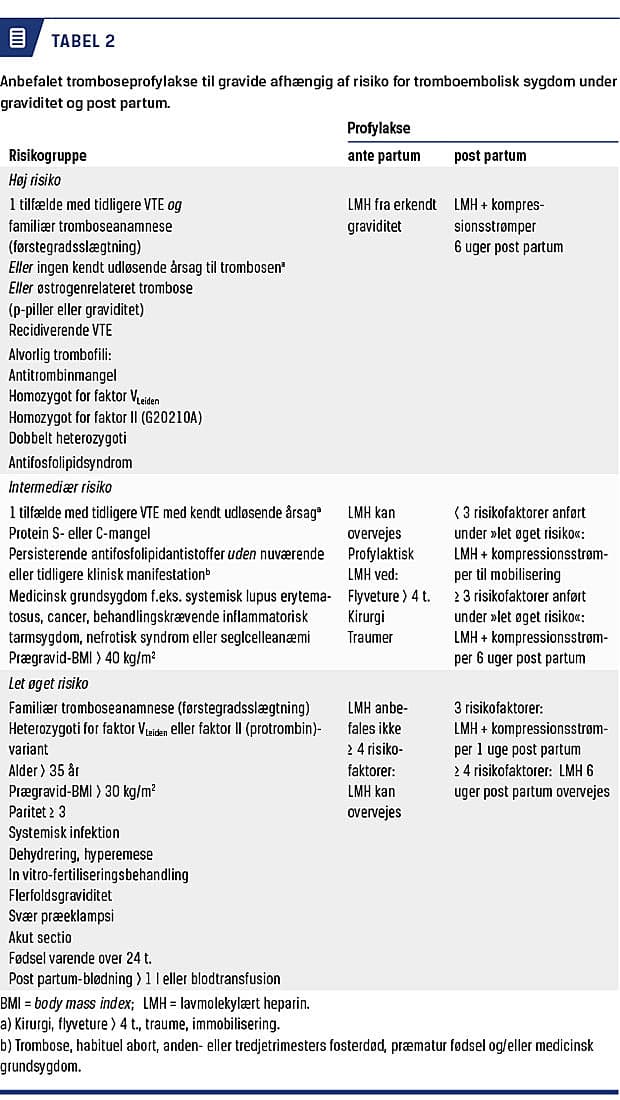 risikoprofil, kvinder der har haft: 1) flere tilfælde af VTE og 2) et tidligere tilfælde af VTE, der var: a) uprovokeret, b) provokeret af kendte udløsende årsager såsom kirurgi, flyveture over fire timer, traume og immobilisering eller c) østrogenprovokeret (p-piller og graviditet). Uprovokeret VTE er formentlig forbundet med højere recidivrisiko end VTE med kendt årsag [13]. Kvinder med tidligere VTE og førstegradsslægtning, der har haft trombose, betragtes som højrisikogravide, idet den familiære ophobning anses for at afspejle en endnu ukendt arvelig trombofilirisiko [14]. Kvinder, der har haft flere tilfælde af VTE, vil ofte være i vedvarende antikoagulansbehandling. Risikoen for recidiv i forbindelse med en graviditet er markant, og tromboseprofylakse under graviditeten og post partum anbefales hos gravide, som har haft recidiverende VTE (Tabel 2) [15].