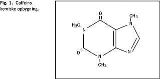 Caffein er et plantealkaloid (1,3,7 trimethylxanthin) i familie med adenin og guanin (Fig. 1 ), der indgår som byggesten i DNA-strukturen. Caffein biotransformeres i leverens cytochrom P-450-system, og kun cirka 2% udskilles uomdannet i urinen hos voksne. Hos nyfødte udskilles 85% af caffeinen uomdannet i urinen, og halveringstiden er 3-4 døgn. Caffeinindholdet i en kop kaffe er ca. 100 mg, i en kop te ca. 45 mg, i 1/2 l cola ca. 50 mg, i en kop kakao ca. 4 mg og i 100 g mørk chokolade ca. 100 mg. Caffein virker stimulerende på nervesystemet og muskulaturen og øger diuresen. I mutagentest in vivo synes caffein at have en svag mutagen effekt.