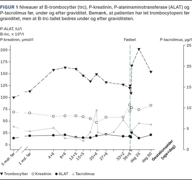Figur 1 viser udviklingen af koncentrationerne af henholdsvis P-alaninaminotransferase (ALAT), P-kreatinin, B-trombocytter og P-tacrolimus gennem graviditet, fødsel og initial barsel.