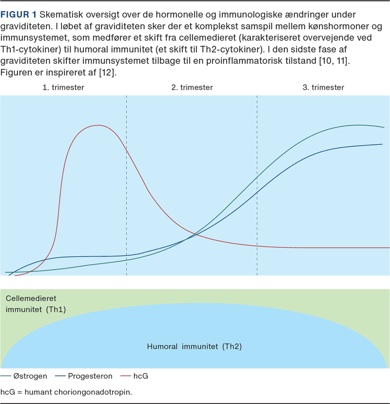 Graviditet karakteriseres af en særlig immunologisk tilstand, fordi den gravides immunforsvar skal affinde sig med et genetisk fremmed foster og samtidig skal forsvare fosteret mod omgivelserne [6, 8]. De immunologiske forandringer, som finder sted i løbet af en normal graviditet, spiller en vigtig rolle i kvindens modtagelighed over for infektioner og risikoen for at få et mere alvorligt sygdomsforløb i tilfælde af smitte [4-6]. Selvom mekanismerne bag disse ændringer ikke er fuldt belyste, kan den øgede modtagelighed ikke alene forklares med systemisk immunsuppression hos kvinden [5].
