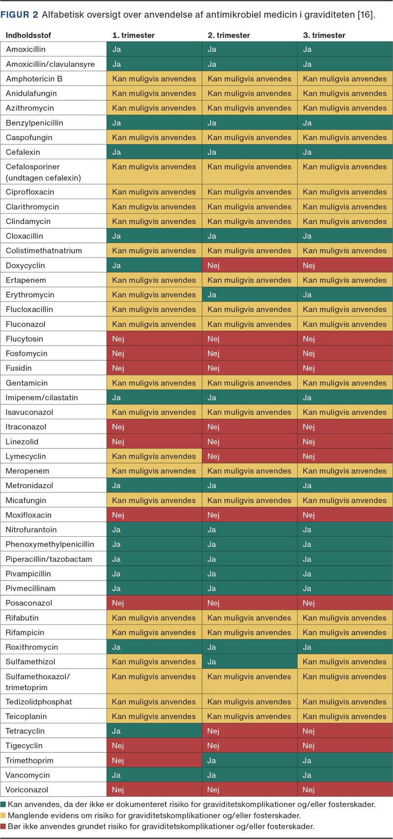 Behandling med antimikrobiel medicin i graviditeten kan være en udfordring – både i vurdering af indikation og valg af antimikrobiel behandling. Behandlingen kan være skadelig for fosteret, men kan omvendt være særlig nødvendig under graviditeten [15]. Se Figur 2 for et overblik over, hvilken antimikrobiel medicin som er sikker at anvende i forbindelse med graviditet.