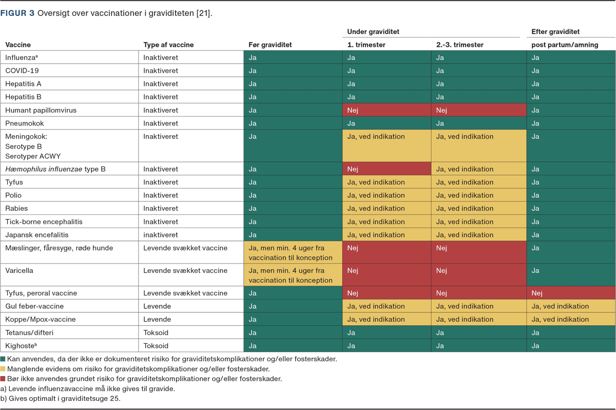 I Danmark anbefaler Sundhedsstyrelsen, at gravide rutinemæssigt bliver vaccineret mod covid-19, influenza og kighoste [23, 24]. Øvrige vacciner kan anbefales afhængig af den gravides komorbiditet, risiko for eksponering og tidligere vaccinationsstatus (Figur 3) [25].