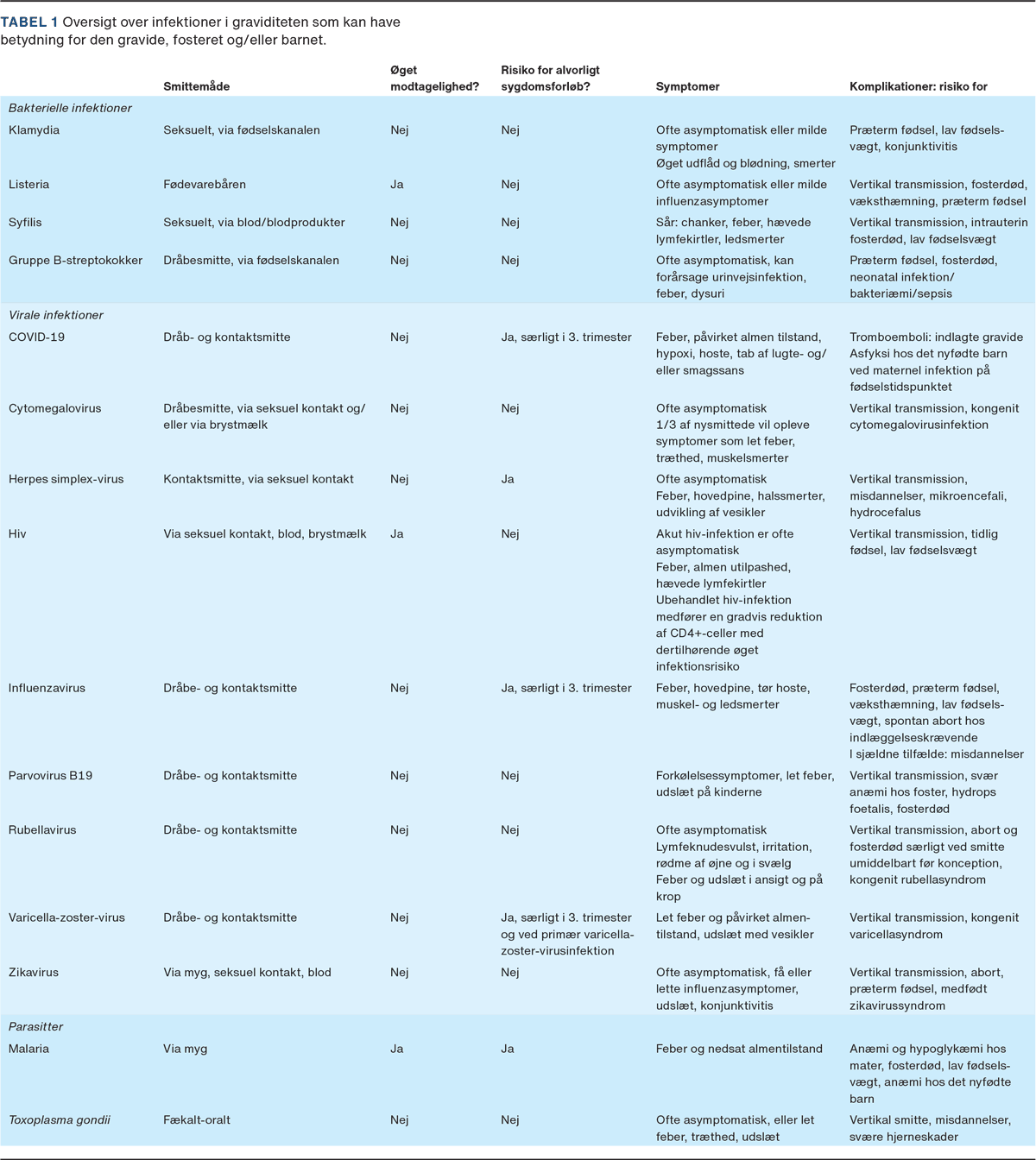 Øvre luftvejsinfektioner, influenza, urinvejsinfektioner og vaginale infektioner er derimod alle meget almindelige under graviditeten [2]. Nogle af disse infektioner er associerede med både en øget modtagelighed og et mere alvorligt sygdomsforløb hos den gravide (Tabel 1).