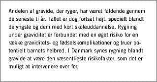 Summary Tobacco and pregnancy: a summary with special focus on Denmark Ugeskr Læger 2003;165:4537-4540 This article summarises the literature on the prevalence of smoking during pregnancy, the complications associated with smoking, and the possibilities for intervention to stop smoking during pregnancy with a focus on specifically Danish issues. Based on data about the smoking habits of pregnant women in Aarhus, Denmark, the proportion of pregnant smokers has decreased considerably during the past decade. The results from several epidemiological studies suggest that smoking during pregnancy has a negative influence on the course of the pregnancy and on the infant's morbidity and survival. In the latest updated Cochrane Review it is concluded that smoking cessation programs in pregnancy appear to reduce smoking, low birth weight, and preterm delivery.