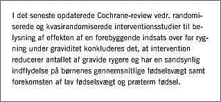 I det seneste opdaterede Cochrane-review vedrørende randomiserede og kvasirandomiserede interventionsundersøgelser blandt gravide rygere konkluderes det, at intervention over for rygning under graviditet reducerer andelen af gravide, der ryger, og har en sandsynlig indflydelse på den gennemsnitlige fødselsvægt samt forekomsten af lav fødselsvægt og præterm fødsel [6]. I review 'et indgår undersøgelser af meget varierende interventionsformer med stor spredning i intensitet og effektivitet, og de enkelte interventionsformer er ikke søgt vurderet. Danske undersøgelser har vist, at massekampagner rettet generelt mod gravides livsstilsvaner, ligesom uddannelse af en gruppe jordemødre og integration af rygeafvænning inden for rammerne af den normale svangreprofylakse ingen effekt har på gravides rygevaner [8]. Nikotinplastre har sammenlignet med placeboplastre ingen yderligere effekt på rygeophør under graviditet, hvorimod intensiv vejledning fra en specialuddannet jordemoder synes at kunne øge andelen af ikkerygere blandt gravide [10].