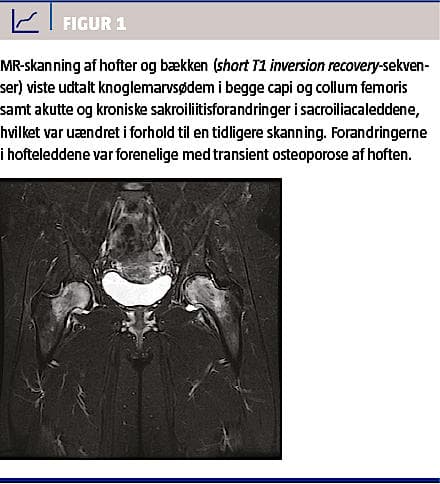 Ved en MR-skanning af hofter og bækken sås udtalt knoglemarvsødem i begge capi og collum femoris samt akutte og kroniske sakroiliitisforandringer i sacroiliacaleddene, hvilket var uændret i forhold til den tidligere skanning (Figur 1). Forandringerne i hofteleddene var forenelige med TOH.