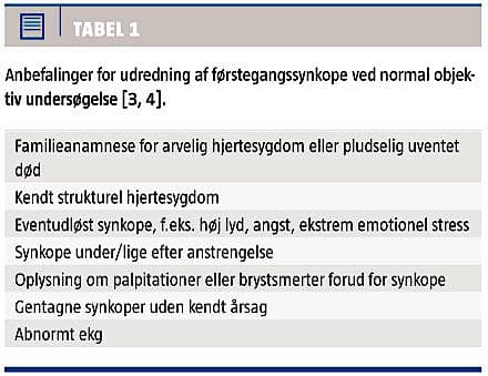 En 12-årig dreng blev udredt ambulant pga. to tilfælde af synkope i løbet af seks måneder. Synkoperne var ikke forudgået af kardielle symptomer. Der blev fundet normale forhold ved objektiv undersøgelse, ekg og ekkokardiografi (EKKO). Det blev oplyst, at der ikke var kendt hjertesygdom i familien. Drengen blev set igen 18 måneder efter første besøg, og udredningen blev afsluttet i overensstemmelse med retningslinjerne (Tabel 1), da der ikke havde været yderligere synkopetilfælde.