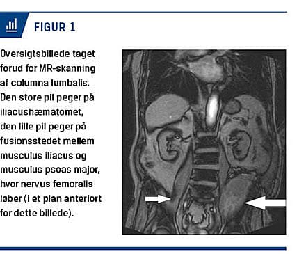 En 83-årig warfarinbehandlet mand (international normaliseret ratio (INR) = 3,4) blev indlagt efter et fald, hvor han havde pådraget sig et traume på venstre hofte. Objektivt fandt man et 8 cm i diameter stort subkutant hæmatom ud for venstre crista iliaca. En røntgenoptagelse af hoften viste ikke tegn på fraktur. På grund af svære lyskesmerter blev han indlagt til smertebehandling og mobilisering. Smerterne aftog på morfinbehandling, og i det efterfølgende døgn kunne han selv gå til og fra toilettet ved hjælp af en rollator. I det andet døgn kunne han ikke længere selv rejse sig fra en stol og kunne kun mobiliseres med en høj gangvogn og to personers hjælp. Han kunne ikke aktivt løfte venstre ben og klagede over kraftige brændende smerter, der strålede ned på forsiden af låret. Kontaktlægen fandt ophævet evne til hoftefleksion og knæekstension på venstre side (kraftgrad 2) samt patellar arefleksi. Desuden blev der fundet nedsat sensibilitet anteriort på femur og medialt på crus. På mistanke om rodpåvirkning blev der foretaget en MR-skanning af columna lumbalis, men den viste ikke tegn på diskusprolaps eller akutte forandringer. En uge efter indlæggelsen havde patienten fortsat et synligt hæmatom ud for venstre crista iliaca, og INR var steget til 4,3 (han var blevet febril pga. samtidig urinvejsinfektion og pneumoni), derfor overvejede man, om han også havde et intrapelvint hæmatom, der medførte nervekompression. Den oprindelige MR-skanning blev derfor revurderet, og på scout view’et kunne man tydeligt se et hæmatom på 8 × 12 cm i m. iliacus (Figur 1).