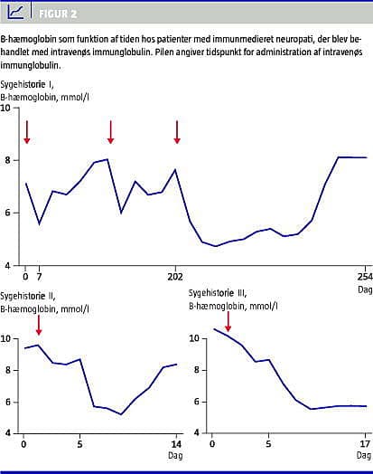 I. En 85-årig kvinde med blodtype AB, der var i vedligeholdelsesbehandling med IVIg 2 g/kg legemsvægt for CIDP, blev indlagt ultimo marts 2010 for appetitløshed. Hun havde gullig misfarvning af huden og klagede over tiltagende træthed. Fire dage før indlæggelsen blev patienten behandlet med IVIg. Blodprøverne viste HA med lavt haptoglobin, retikulocytose, forhøjet bilirubin, forøget laktatdehydrogenase (LDH) og positiv direkte antiglobulin test (DAT). Hæmoglobin faldt fra 7,6 mmol/l til 4,7 mmol/l efter behandling, og i forbindelse med de to forudgående Ig-infusioner konstaterede man hæmoglobinfald (Figur 2 ). Patienten blev udredt for malign lidelse, som blev udelukket. Efterfølgende blev hun behandlet med prednisolon.