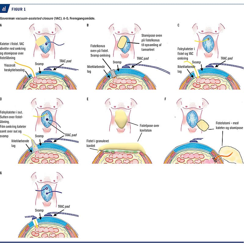 Vacuum-assisted closure-behandling i kombination med en kreativ tilgang anvendes til at opnå fistelkontrol, undgå kontaminering samt successiv reduktion af bugvægsdefekten.