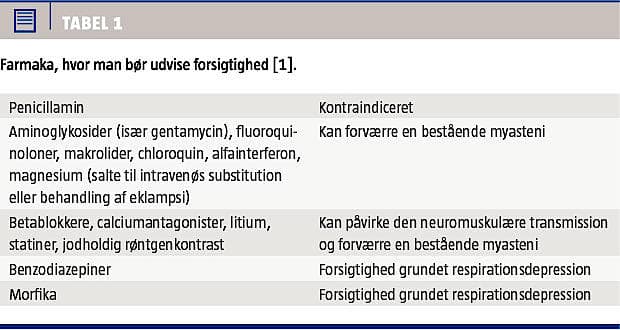 MG er en autoimmun sygdom med en prævalens på 7,7 pr. 100.000 indbyggere, og den årlige incidens er 0,4 pr. 100.000 indbyggere [2]. Årsagen er ukendt, men thymus synes at være involveret; ofte ses der hyperplasi af thymus, og 10% har tymom. MG er rettet mod acetylkolinreceptorerne i den motoriske endeplade. Denne er kontaktpunktet mellem den motoriske nervecelle og skeletmusklen. Et aktionspotentiale frigør acetylkolin, som diffunderer over den synaptiske kløft og bindes til acetylkolinreceptorerne, hvilket medfører en muskelkontraktion (Figur 1). Hos hovedparten af patienterne påvises der acetylkolinreceptorantistof, mens der hos få ses antistoffer mod muskelspecifik tyrosinkinase [1]. Antistofferne blokerer acetylkolinreceptorerne og medfører en destruktion af receptorerne. MG forårsager en neuromuskulær transmissionsdefekt, der klinisk viser sig ved kraftnedsættelse og hurtig udtrætning af skeletmuskulaturen. MG findes i en okular lokaliseret form, hvor omkring 50% af patienterne er positive for acetylkolinreceptorantistof, men oftest ses en generaliseret form med både okular og muskulær involvering, og af disse patienter vil op mod 80-85% være positive for acetylkolinreceptorantistof [1]. Symptomerne er dobbeltsyn, ptose, talebesvær, øget træthed, nedsat ansigtsmimik, tygge- og synkebesvær og en øget risiko for luftvejsinfektioner. Endvidere er der stigende med alderen og graden af eventuel komorbiditet en risiko for udvikling af respirationsinsufficiens. Desuden ses der affektion af truncusmuskulaturen og nedsat vitalkapacitet. Prognosen bedres ved behandling med immunosuppressiva og immunmodulerende terapi. Fatal udgang er sjælden og skyldes oftest respirationsinsufficiens. Førstevalgsbehandling af MG er acetylkolinesterasehæmmeren pyridostigmin. Tymektomi foretages hos alle patienter med tymom. En række farmaka kan forværre sygdommen og bør derfor undgås (Tabel 1).