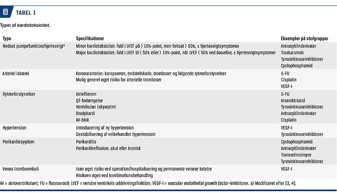 om kardiovaskulære komplikationer (kardiotoksicitet) af den medicinske kræftbehandling med fokus på antracykliner, trastuzumab og 5-fluorouracil (5-FU). Eksempler på andre relevante stofgrupper er nævnt i Tabel 1 [1]. Bivirkninger af strålebehandling er tidligere beskrevet i Ugeskrift for Læger [5].