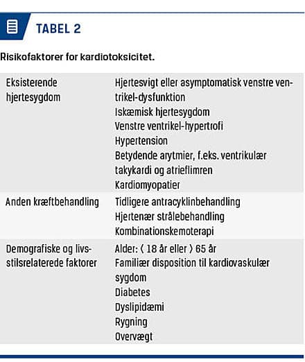 sarkomer og en række hæmatologiske tilstande. Myocytskaden er afhængig af kumulativ dosis og beskrives ofte som irreversibel, men reversibilitet er set i klinisk praksis [8]. Risikofaktorer for udvikling af kardiotoksicitet er som anført i Tabel 2. Patienten har ofte asymptomatisk påvirkning af venstre ventrikels pumpefunktion, peri(myo)karditis, eller hjertesvigtssymptomer