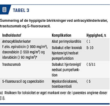 Et antracyklin er en topoisomerase II-inhibitor, og behandling med antracyklin (Tabel 3) eller beslægtede atracenedioner (mitoxantron) kan medføre kardiotoksicitet [7]. Antracykliner anvendes alene eller i kombination med andre kemoterapeutika ved brystkræft,