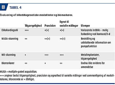 Monitorering af venstre ventrikels pumpefunktion i et behandlingsforløb kan foretages med ekkokardiografi, multiple-gated acquisition (MUGA)-skanning eller MR-skanning. Undersøgelserne har hver for sig fordele og ulemper (Tabel 4), men serielle bestemmelser af hjertets pumpefunktion ved en metode med beskeden undersøgelses- og observatørvariation vil være at foretrække. De tre undersøgelsesmodaliteter har ikke samme normalreference, hvorfor resultater fra forskellige undersøgelsestyper ikke umiddelbart kan sammenlignes [24, 25].