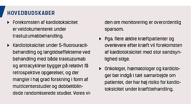 Artiklen omhandler den nuværende viden om forebyggelse, monitorering og behandling af kardiotoksicitet induceret af antracykliner, trastuzumab, 5-FU og derivater. Området er præget af små primært retrospektive studier og ikke evidensbaserede konsensusanbefalinger, hvorfor det er forfatternes konklusion, at der i høj grad mangler data fra multicenterstudier, dobbeltblindede randomiserede studier og større databaser/registre. Det anbefales, at onkologer, hæmatologer og kardiologer arbejder tæt sammen lokalt på dette felt.