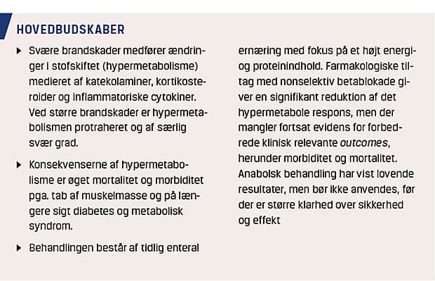 Der foreligger to nye systematiske oversigtsartikler med metaanalyse af propranolols effekter på hypermetabolisme ved alvorlige brandskader [15, 16]. Begge artikler omfatter ti kliniske studier. I den ene artikel ses en positiv effekt af propranolol i form af signifikant nedsat REE, central fedtaflejring og forbedret fedtfri legemsmasse og insulinresistens [15]. I den anden artikel fandt man en lavere hjertefrekvens, et mindre behov for blodtransfusioner og kortere hospitalsindlæggelser hos voksne patienter, der blev behandlet med propranolol, end hos voksne, der ikke blev behandlet med propranolol. Forfatterne fandt ingen forskel i mortalitet, hvilket imidlertid var stærkt begrænset af, at man kun i ét af de inkluderede studier havde mortalitet som primært outcome [16]. I begge studier konkluderede man dog, at der fortsat forelå begrænset evidens for anvendelsen af propranolol i forhold til klinisk relevante outcomes. Propranolol er generelt veltålt, men kan – om end sjældent – foranledige bradykardi, arytmier, respirationssvigt og død som følge af sepsis [17].