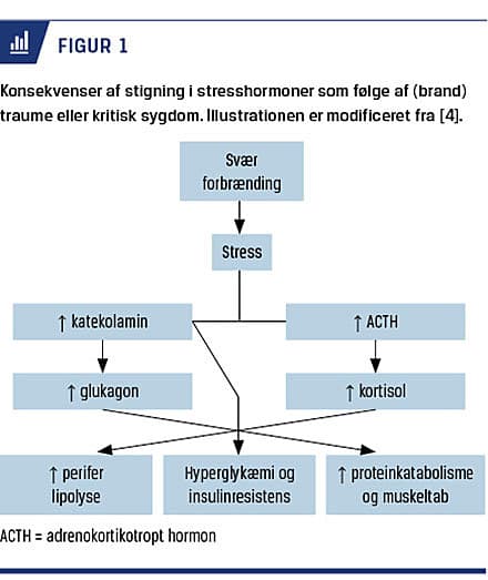 Hypermetabolisme er et generelt udtryk for et øget totalt iltforbrug i kroppen og defineres mere specifikt som et hvileenergiforbrug (resting energy expenditure (REE)) på mindst 10% over normalen [3]. Som følge af det forøgede energiforbrug forekommer der en hurtigere substratomsætning og efterfølgende tab af perifert fedt og muskelmasse. Samtidig er responset karakteriseret ved hyperglykæmi og insulinresistens, som på længere sigt kan føre til metabolisk syndrom og stressinduceret diabetes (Figur 1) [3, 4]. Tidlig erkendelse og behandling er vigtig for at forbedre det kliniske resultat i såvel den akutte fase som i efterforløbet.