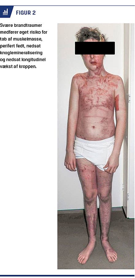 Større brandskader medfører ændringer i væksthormon (GH) og insulinlignende vækstfaktor (IGF)-1-aksen. Hos børn er konsekvensen af de lave IGF-1-niveauer en hæmning af væksten [20]. Der findes adskillige præliminære kliniske studier med børn, og disse studier har vist, at rekombinant GH (rhGH) kan reducere hjertets minutvolumen, hypermetabolisme og på længere sigt medføre øget kropsvægt, fedtfri legemsmasse, knoglemineralindhold og stigning i højdepercentiler 1-2 år efter brandskaden [3]. Blandt kritisk syge voksne, som var indlagt på intensivafsnit, har man i to ældre, randomiserede, placebokontrollerede multicenterstudier imidlertid fundet en negativ effekt af væksthormon med bl.a. øget mortalitet, længere indlæggelsesvarighed på både hospital og intensivafsnit samt prolongeret varighed af mekanisk ventilation [21]. Nyere studier med voksne brandsårspatienter har dog vist gunstig effekt af vedvarende rhGH-behandling i rehabiliteringsfasen [22]. Den kliniske anvendelse af rhGH hos kritisk syge er fortsat kontroversiel.