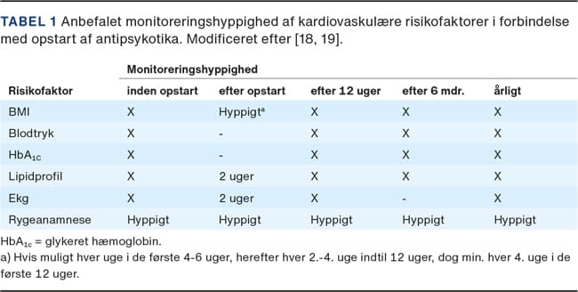 På baggrund af den øgede kardiovaskulære risiko blandt patienter med skizofreni har Sundhedsstyrelsen (2014) og The British Association of Psychopharmacology (2016) formuleret retningslinjer til monitorering og håndtering af metaboliske bivirkninger af antipsykotika [18, 19]. Her anbefales det at monitorere patienterne særdeles tæt i forbindelse med påbegyndelse af behandling med antipsykotika (Tabel 1). Der gøres opmærksom på, at evidensniveauet for anbefalingerne er lavt iht. standard of good practice [19]. Dog synes skærpet opmærksomhed på metaboliske bivirkninger, navnlig i begyndelsen af behandlingsforløbet, at være fornuftigt, idet en mindre gruppe oplever meget hurtigt indsættende vægtøgning.