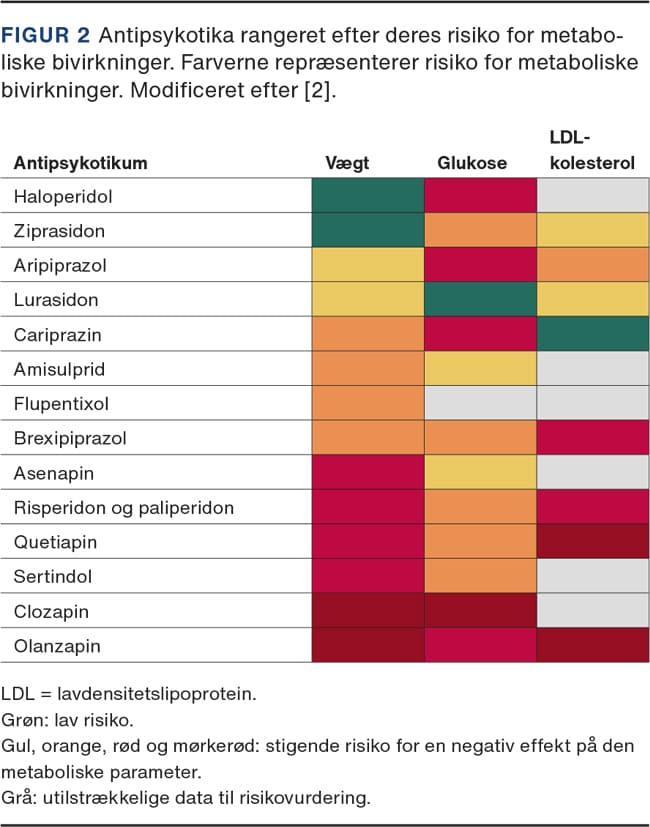 Skizofreni er en almindeligt forekommende og invaliderende sindslidelse, som rammer omkring 1% af befolkningen og udgør en enorm sygdomsbyrde for den enkelte og samfundet [1]. Antipsykotika er hjørnestenen i behandlingen, men er samtidig associeret med en betydelig vægtøgning og en række andre metaboliske bivirkninger [2, 3]. Dette er særdeles uhensigtsmæssigt for patienter med skizofreni, idet prævalensen af overvægt, type 2-diabetes og hyperkolesterolæmi er 3-5 gange højere hos denne patientgruppe end i baggrundsbefolkningen [4]. Endvidere er den forventede levealder for patienter med skizofreni 15-25 år kortere end for baggrundsbefolkningen, hvilket hovedsageligt skyldes somatiske lidelser, herunder hjerte-kar-sygdom [5]. Selvom langtidsbehandling med antipsykotika er associeret med reduceret morbiditet og mortalitet [6], bør bivirkningsprofilen for det enkelte antipsykotikum spille en rolle for præparatvalg [3]. Formålet med denne artikel er at belyse de betydelige forskelle, der er imellem de tilgængelige præparater, og beskrive baggrunden for metaboliske bivirkninger af antipsykotika. Således kan artiklen være en støtte for klinikeren med hensyn til et præparatvalg, der medregner risikoen for metaboliske bivirkninger. Derudover vil der i artiklen komme praktiske forslag til håndtering af metaboliske bivirkninger af antipsykotika i klinikken.