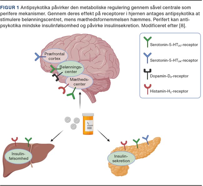 Antipsykotikainduceret vægtøgning skyldes grundlæggende en ubalance mellem fødeindtag og energiforbrug [11]. Mekanismerne bag denne ubalance er særdeles komplekse og ufuldstændigt belyst. Såvel prækliniske som kliniske data tyder imidlertid på, at effekter, der er relateret til de enkelte præparaters receptorbindingsprofiler er associeret med metaboliske bivirkninger [8]. Således har man påvist, at en antagonistisk effekt på dopamin-D2-receptorer, serotonin-5-HT2A-receptorer, serotonin-5-HT2C-receptorerog histamin-H1-receptorer er associeret med forstyrrelser i belønnings- og mæthedscentre i hjernen og derigennem øget fødeindtag, (Figur 1) [8]. Ligeledes menes anvendelse af antipsykotika at mindske fysisk aktivitet og dermed energiforbruget, om end dette er utilstrækkeligt belyst [11]. Type 2-diabetes og dyslipidæmi forekommer ofte sekundært til vægtøgning. Særligt visse andengenerationsantipsykotika synes imidlertid at kunne påvirke fedt- og glukosemetabolismen uafhængigt af vægtøgning [10]. Således menes præparaterne i kraft af deres receptorbindingsprofiler at have en lang række perifere effekter, der bl.a. kan medføre opregulering af kolesterolsyntese, påvirkning af insulinsignalering og derigennem nedsat insulinfølsomhed [8, 10].