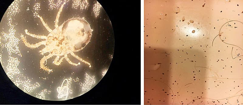 På billederne ses D. gallinae i mikroskop og mider i en håndvask efter hårkæmning.