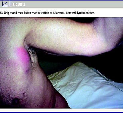 Tularæmi (harepest) er en zoonose, der forårsages af den lille intracellulære gramnegative stav, Francisella Tularensis [1]. I Danmark blev tularæmi første gang beskrevet i 1987, og på Statens Serum Institut (SSI) diagnosticeres der 0-4 tilfælde årligt [1, 2]. Sygdommen forekommer endemisk i Nordamerika og i de nordlige dele af Asien og Europa, bl.a. de skandinaviske lande, omend Danmark stadig betragtes som et ikkeendemisk område. Sygdommen er ikke beskrevet i Afrika. Mennesker erhverver sygdommen ved kontakt med inficerede dyr og insekter eller ved indtagelse af kontamineret vand [3]. Vektorer er bl.a. flåter og små dyr som harer og gnavere. Inokulum er lille (< 10 bakterier). Den hyppigste indgangsport er huden. Andre indgangsporte er konjunktival inokulation, inhalation eller ingestation resulterende i henholdsvis øjeninfektion, pneumoni eller orofaryngeal eller gastrointestinal tularæmi. Efter en inkubationstid på 3-5 dage karakteriseres det kliniske forløb af lokal rødme, træthed, muskel- og ledsmerter, feber og hovedpine. Vi beskriver her et tilfælde af tularæmi erhvervet i Danmark.