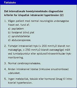 Idiopatisk intrakraniel hypertension (IIH) er en tilstand, der er kendetegnet ved forhøjet intrakranielt tryk (ICP) uden påviselig klinisk, biokemisk eller radiologisk patologi. Vigtige differentialdiagnoser er tumorer, hydrocefalus og sinustrombose. De kliniske manifestationer er svær daglig hovedpine, pulsatorisk tinnitus, sløret syn, dobbeltsyn og transitoriske visuelle obskurationer [1]. Det Internationale Hovedpineselskab har opstillet diagnostiske kriterier til klassifikation af IIH [2].