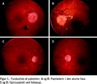 Objektivt var patienten klar og orienteret. Hun var afebril uden nakke-ryg-stivhed. Ved oftalmoskopi fandtes svært bilateralt papilødem (Figur 1). Visus var 0,2 på højre øje, og der var svag lyssans på venstre øje. Fraset de oftalmologiske fund var såvel neurologisk som almen klinisk undersøgelse normal. Akut computertomografi af cerebrum var normal og magnetisk resonans-skanning med venøse sekvenser viste ingen tegn på sinustrombose.