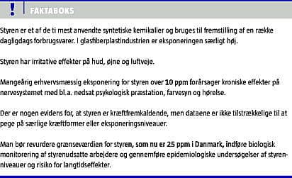 Summary Health effects following occupational styrene exposure in the reinforced plastics industry Ugeskr Læger 2012;174(5):267-270 This is a summary of the health risks of occupational styrene exposure based on recent reviews. We conclude about the exposure levels that there is strong evidence that styrene causes acute irritation of eyes and respiratory tract above 25 ppm, genotoxic effects above 10 ppm, and persistent nervous system effects with for instance reduced psychological performance, colour discrimination and hearing level following long-term styrene exposure above 10 ppm. There is moderate evidence of a causal association with cancer, but data are not sufficient to allow us to pinpoint specific cancers at risk or relevant exposure levels. We recommend reconsideration of the current Danish threshold limit value of 25 ppm, biological monitoring of styrene exposed workers, and epidemiological analyses of styrene exposure levels and long-term health effects among employees of the Danish reinforced plastics industry.
